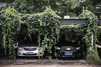 車庫(kù)的上層爬滿藤蔓植物,將車位的金屬鋼板及鋼架完全覆蓋,已無(wú)法看出原來(lái)的模樣。