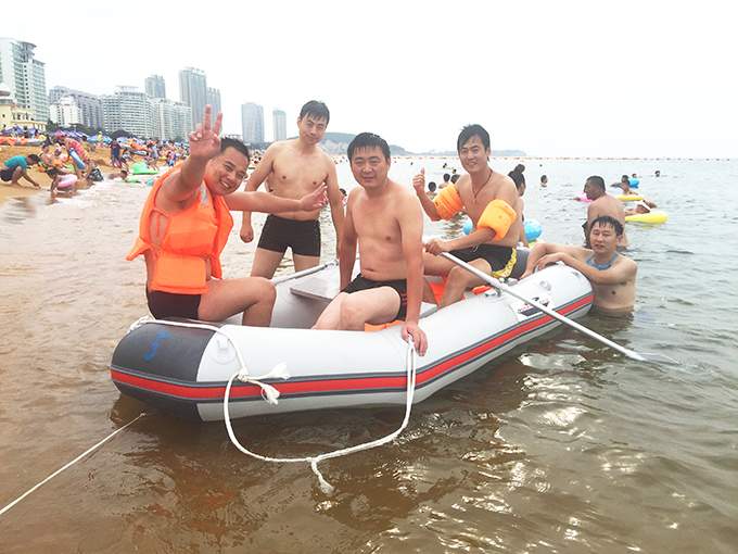 吃過午飯,我們一行人來到了威海國際海水浴場(chǎng),不愧是國際海水浴場(chǎng),灘緩沙細(xì),水質(zhì)清澈,松林環(huán)繞?;ú?、石雕點(diǎn)綴于岸邊,令人新曠神怡。看著那迷人的海灘和不斷奔涌而上的浪潮,遠(yuǎn)處氣勢(shì)磅礴的海面卷起的層層浪花,走在沙灘上,感受著浪花在腳上一次次的沖刷。換上泳衣,租個(gè)皮劃艇,同事們迫不及待的開始下水了。